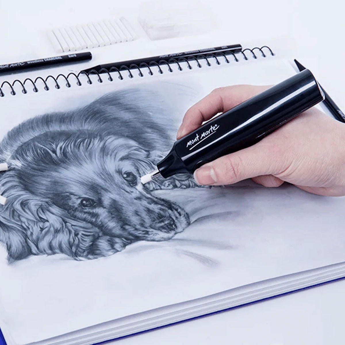 Enhance your erasing precision with the Mont Marte Electric Eraser, complete with 30 refills. Perfect for artists, drafters, and students, this electric eraser provides effortless and accurate erasing of graphite, charcoal, and colored pencil marks. The ergonomic design ensures comfort during prolonged use, while the powerful motor delivers consistent performance. The set includes a variety of eraser refills for different erasing needs, from fine details to broad strokes. Whether you're refining sketches, correcting mistakes, or adding highlights, the Mont Marte Electric Eraser offers convenience and reliability for achieving clean, smudge-free results.