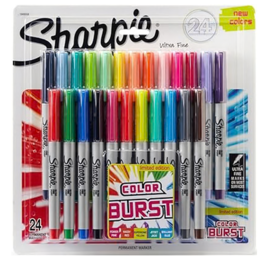 The Sharpie Color Burst Ultra Fine Markers Pack of 24 This dynamic set features an array of intense, eye-catching colors designed to make your work stand out. With ultra-fine tips, these markers deliver precise and detailed lines, perfect for intricate designs, detailed writing, and vibrant coloring. The quick-drying, fade-resistant ink ensures your creations remain vivid and permanent on almost any surface. Elevate your artistic projects with the electrifying hues of Sharpie Color Burst Ultra Fine Markers.